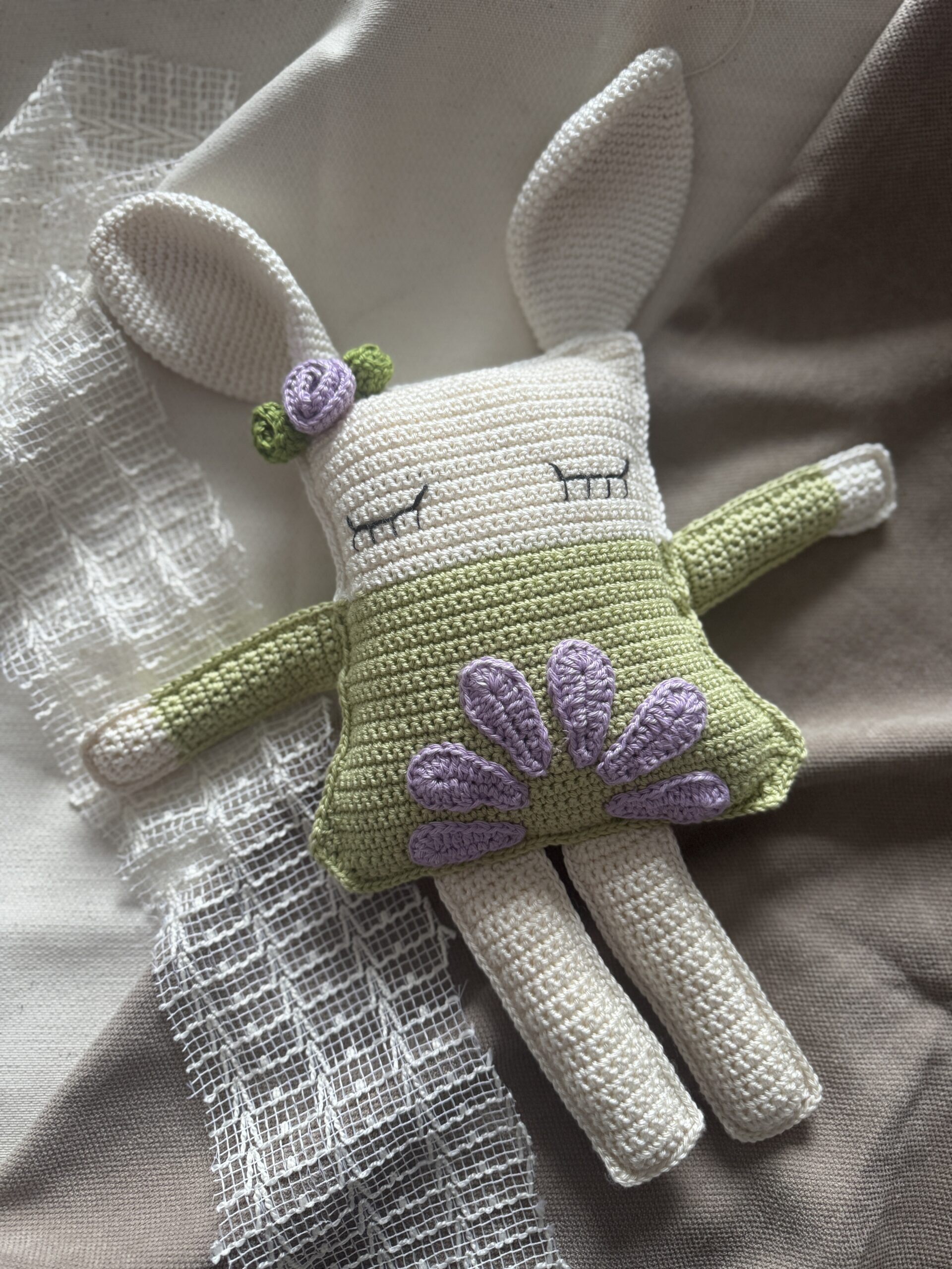 Handgemaakte lappenpop van 100% katoen. Zacht, veilig en een prachtig kraam cadeau voor een baby.